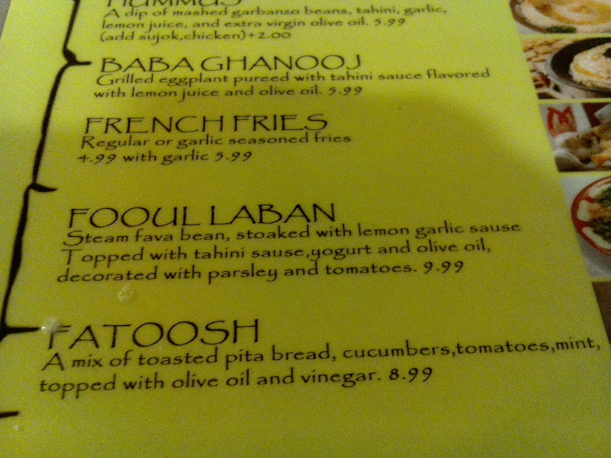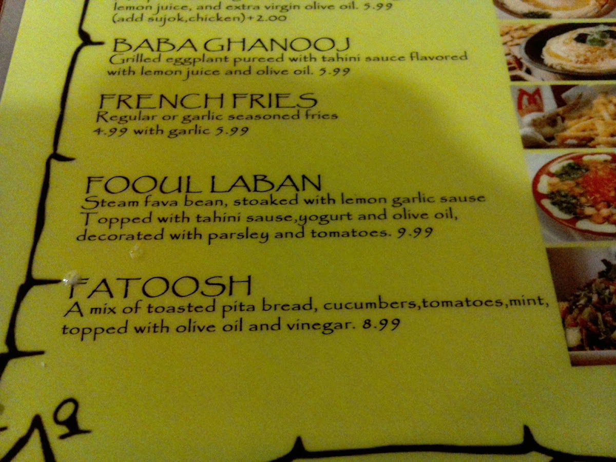The menu offers a selection of Middle Eastern cuisine along with a variety of beverages suitable for different times of the day. It includes options such as traditional appetizers, light meals, and desserts. Customers can find dishes like Baba Ghanooj, Falafel, and Baklava, reflecting the regional culinary influence.
